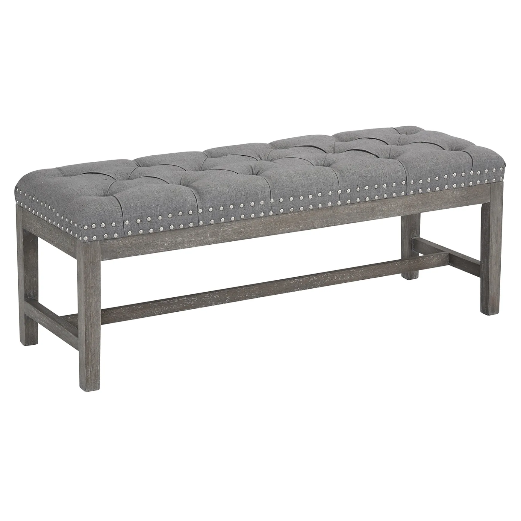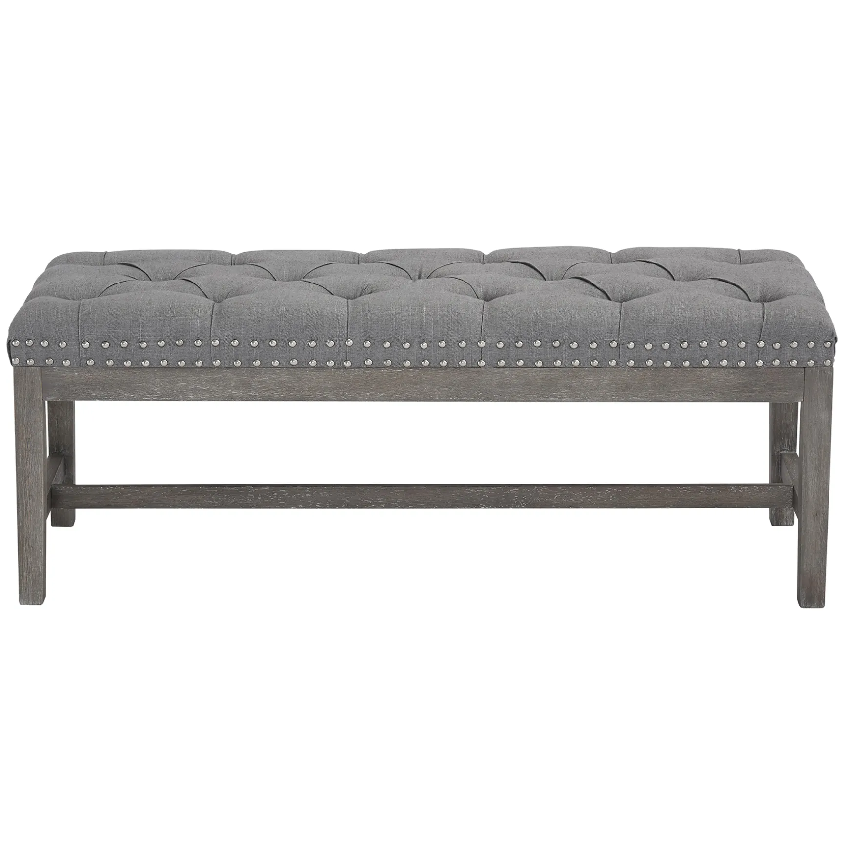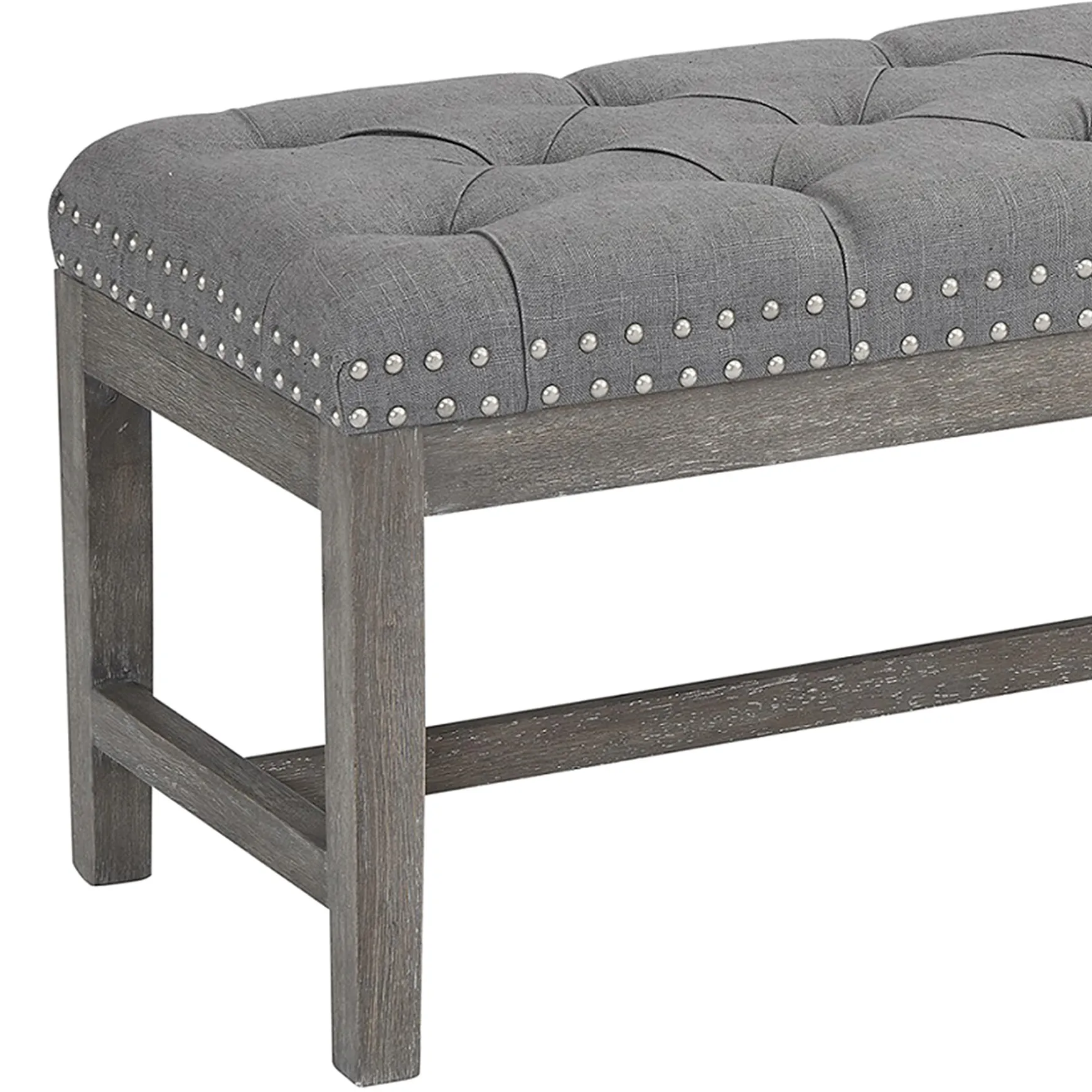 A Collection That Lets Everyone Relax In Style. Polished Finishes And Classic Hues Pair With Fun Finds. Providence Is Where Elegant Settings Still Feel Comfortable And Warm—Exclusively At Home. Whether You’Re Adding The Final Finishing Touch To The Master Suite Or Accenting The Entryway, Our Bold Ferdinand Upholstered Bench Is Sure To Tie Your Look Together. Featuring A Foam-Filled Fabric Seat With Button Tufting And Studs, This Bench Makes A Comfy And Upscale Addition To Your Aesthetic, While Grey Finished Wood Legs Tie The Piece Together In A Subtle Style.